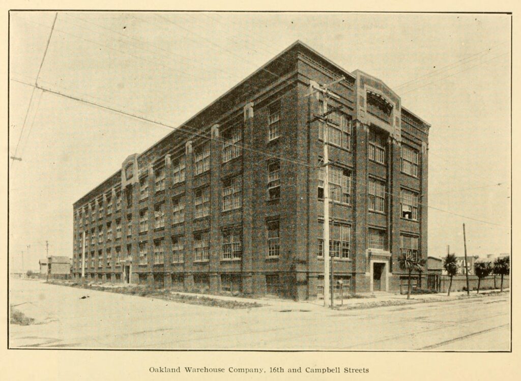The 1902 Sanborn insurance maps show numerous homes and some small businesses in the area, but most of this block was empty. So when the Oakland Warehouse Company needed more room in 1910, this block was a good choice. (Despite the name, the Oakland Warehouse Company manufactured light bulbs.)